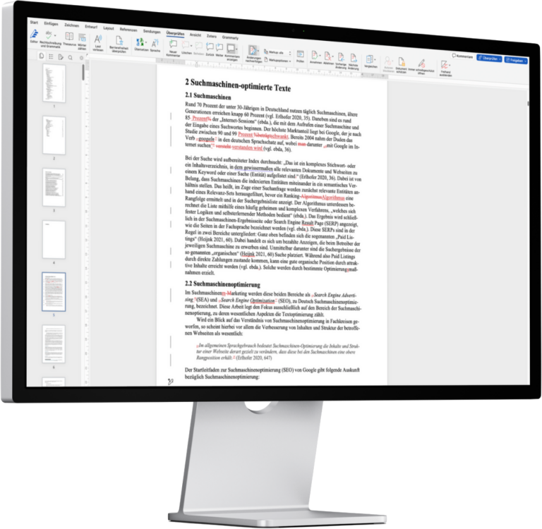 Beim Wissenschaftslektorat erfolgen Optimierungen, die über formale und stilistische Kriterien hinausgehen, ausschließlich in Form von Kommentaren. Das bedeutet: Inhaltliche Anpassungen aufgrund meiner Hinweise nimmst du selbst im Text vor. Auf diese Weise bleibt dein Urheberrecht jederzeit vollständig gewahrt.